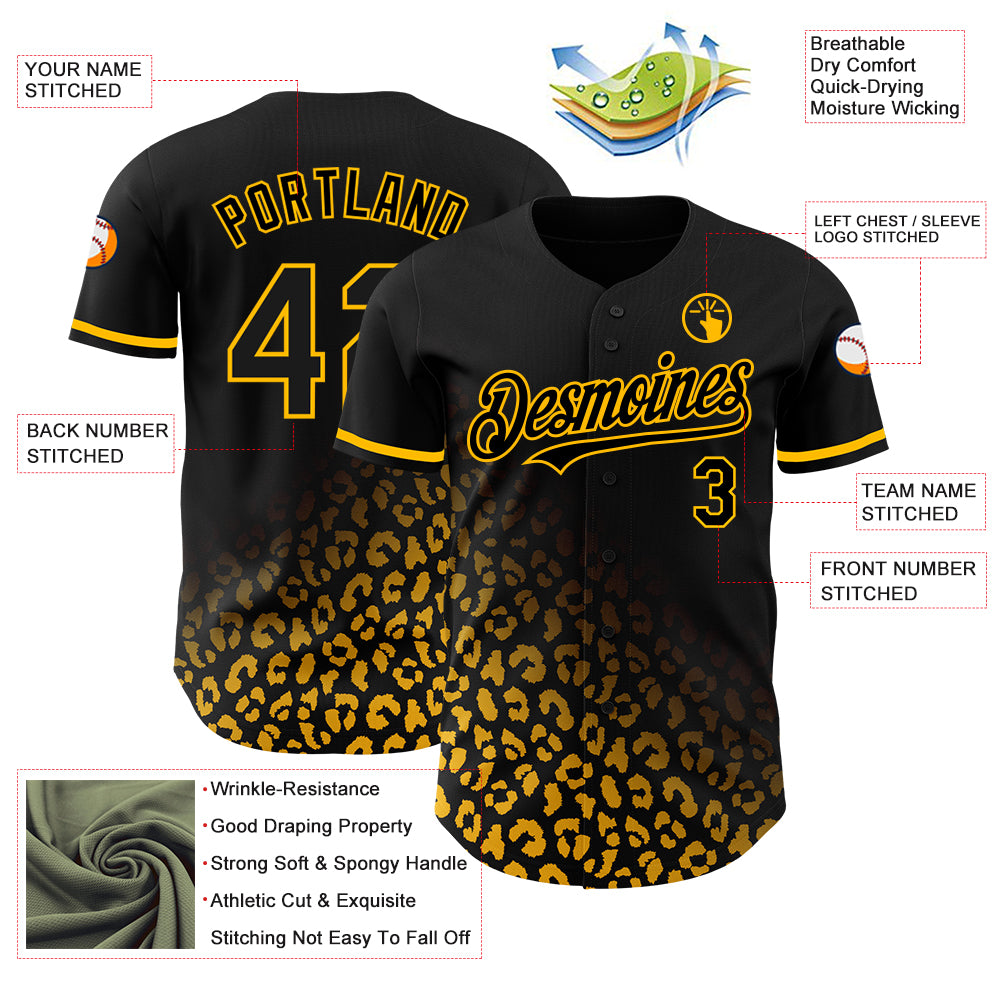 Custom Black Gold 3D Pattern Design Leopard Print Fade Fashion Authentic Baseball Jersey