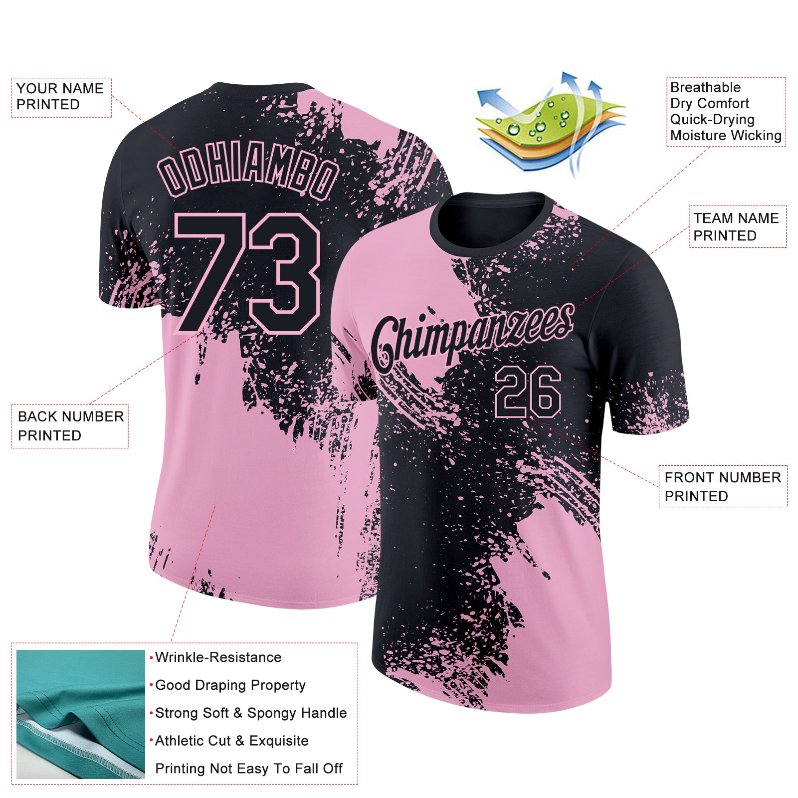 Custom Black Light Pink 3D Pattern Design Abstract Brush Stroke Performance T-Shirt